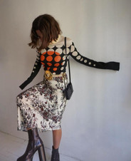 Mientras que, por otro lado, conecta con la experimentación desde un lado más oscuro, jugando con prendas ajustadas, con ataduras, colores opacos y sombríos, dejando ver la piel y su cuerpo desde un punto de vista diferente. Encontrándose en lo sensual y experimental más ligado al dolor y el sufrimiento satisfactorio.